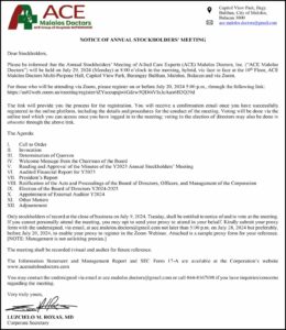 Allied Care Experts (ACE) Malolos Doctors, Inc. to conduct Annual Stockholders’ Meeting on July 29