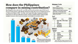 The Philippines fell a notch to 44th out of 110 countries with an index score of 54.8 out of 100 in the latest edition of the Mining Contribution Index (MCI) by the International Council on Mining and Metals (ICMM). The index, which used 2022 data, measures the relative importance of mining to national economies, ranking countries based on three equally weighted indicators which captures mining’s contribution to economic activity.