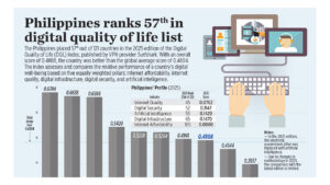 The Philippines placed 57th out of 121 countries in the 2025 edition of the Digital Quality of Life (DQL) Index, published by VPN provider Surfshark. With an overall score of 0.4888, the country was better than the global average score of 0.4804. The index assesses and compares the relative performance of a country’s digital well-being based on five equally weighted pillars: internet affordability, internet quality, digital infrastructure, digital security, and artificial intelligence.