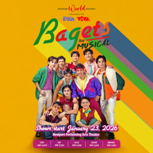 Bagets the Musical opens on Jan. 23 andruns until March at the Newport Performing Arts Theater, Pasay City. Tickets, ranging in price from P1,000 to P4,000, are now available at the Newport World Resorts Box Office and via TicketWorld.