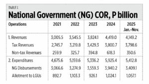 The bulk of our budget deficit comes from interest payments alone, an average of P1.7 billion/day in 2023; P2.1 billion/day in 2024; and P2.4 billion/day in 2025. New financing or net borrowings were P1.45 trillion in the first 11 months of 2025 (see Table 1).