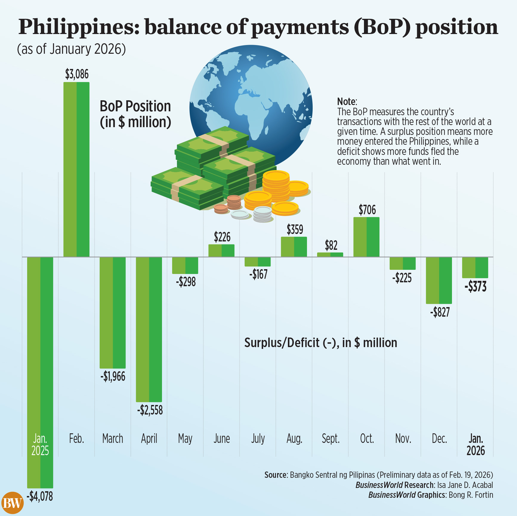 THE PHILIPPINES’ balance of payments (BoP) deficit sharply narrowed to $373 million in the first month of 2026, the Bangko Sentral ng Pilipinas (BSP) reported.