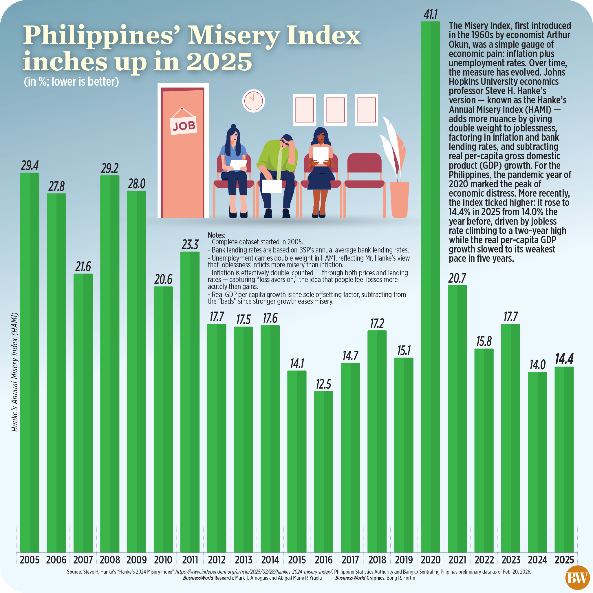 The Misery Index, first introduced in the 1960s by economist Arthur Okun, was a simple gauge of economic pain: inflation plus unemployment rates. Over time, the measure has evolved. Johns Hopkins University economics professor Steve H. Hanke’s version — known as the Hanke’s Annual Misery Index (HAMI) — adds more nuance by giving double weight to joblessness, factoring in inflation and bank lending rates, and subtracting real per-capita gross domestic product (GDP) growth. For the Philippines, the pandemic year of 2020 marked the peak of economic distress. More recently, the index ticked higher: it rose to 14.4% in 2025 from 14.0% the year before, driven by jobless rate climbing to a two-year high while the real per-capita GDP growth slowed to its weakest pace in five years.